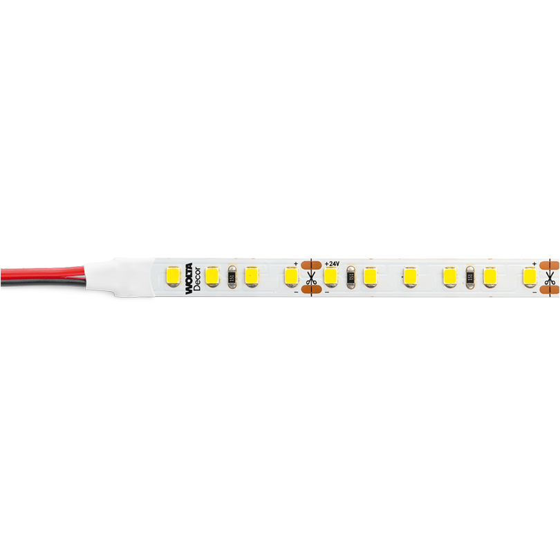 Декоративная светодиодная лента WOLTA®Decor cерии WLS представляет собой современный LED-модуль на гибкой печатной (монтажной) плате, на которой равноудалённо друг от друга расположены мощные светодиоды. Ширина ленты составляет 8-10 миллиметров (в зависимости от модели), а ее толщина со светодиодами 1-2 миллиметра. При изготовлении лента сматывается в катушку длиной 5 метров. Для ограничения подачи тока через наши светодиоды в электрическую схему WLS введены балластные сопротивления (резисторы), которые размещены на самой ленте.